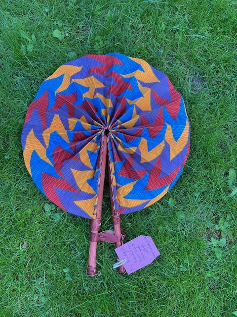 Eventail en tissu Kinté coton et manche solidifié en cuir est fabriqué artisanalement au Ghana, cet éventail qui se glisse facilement dans le sac à main, est un allié indispensale pour les périodes estivales.