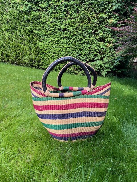 Les paniers traditionnels bolga avec des anses en cuir, sont tressés à la main au Ghana dans la région de Bolgatanga, avec une herbe de la savane, communément appelée, herbe à éléphant. La vannerie de Boltanga est une activité dédiée principalement aux femmes, mais elle est aussi pratiquée par des hommes, car c’est devenu une activité génératrice de revenus et de d’emplois. Ce panier sera un excellent choix pour sa qualité de fabrication artisanale, son charme remarquable et sa bonne conception et le tout à un prix très raisonnable, vu la qualité et l’origine de fabrication. Pour des raisons d’éthique, nous respectons les principes du commerce équitable dans le cadre de notre collaboration avec les fabricants.